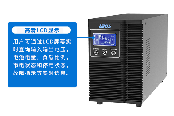用戶可通過LCD屏幕實時查詢輸入輸出電壓,電池電量,負載比例,市電狀態(tài)和停電狀態(tài),故障指示等實時信息。